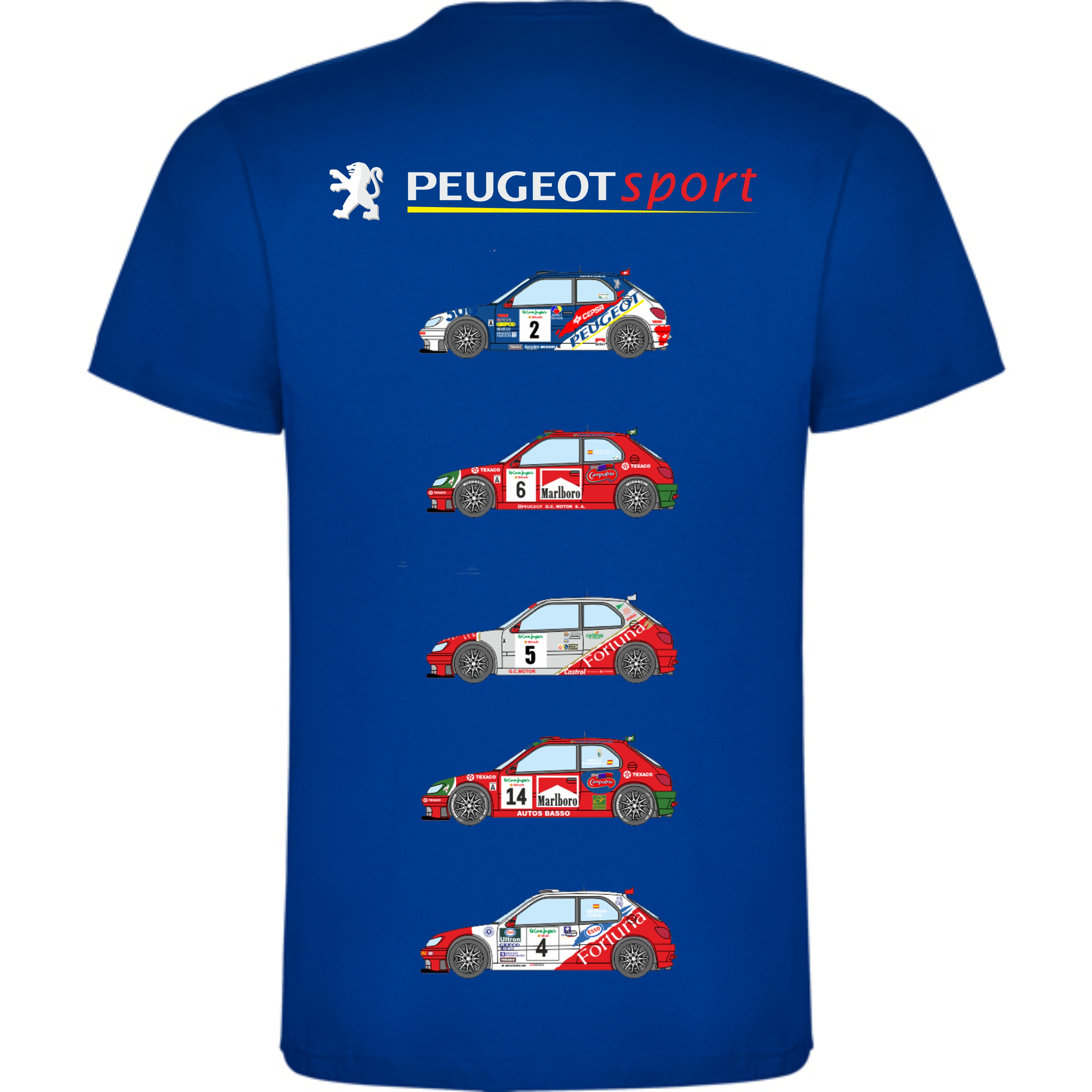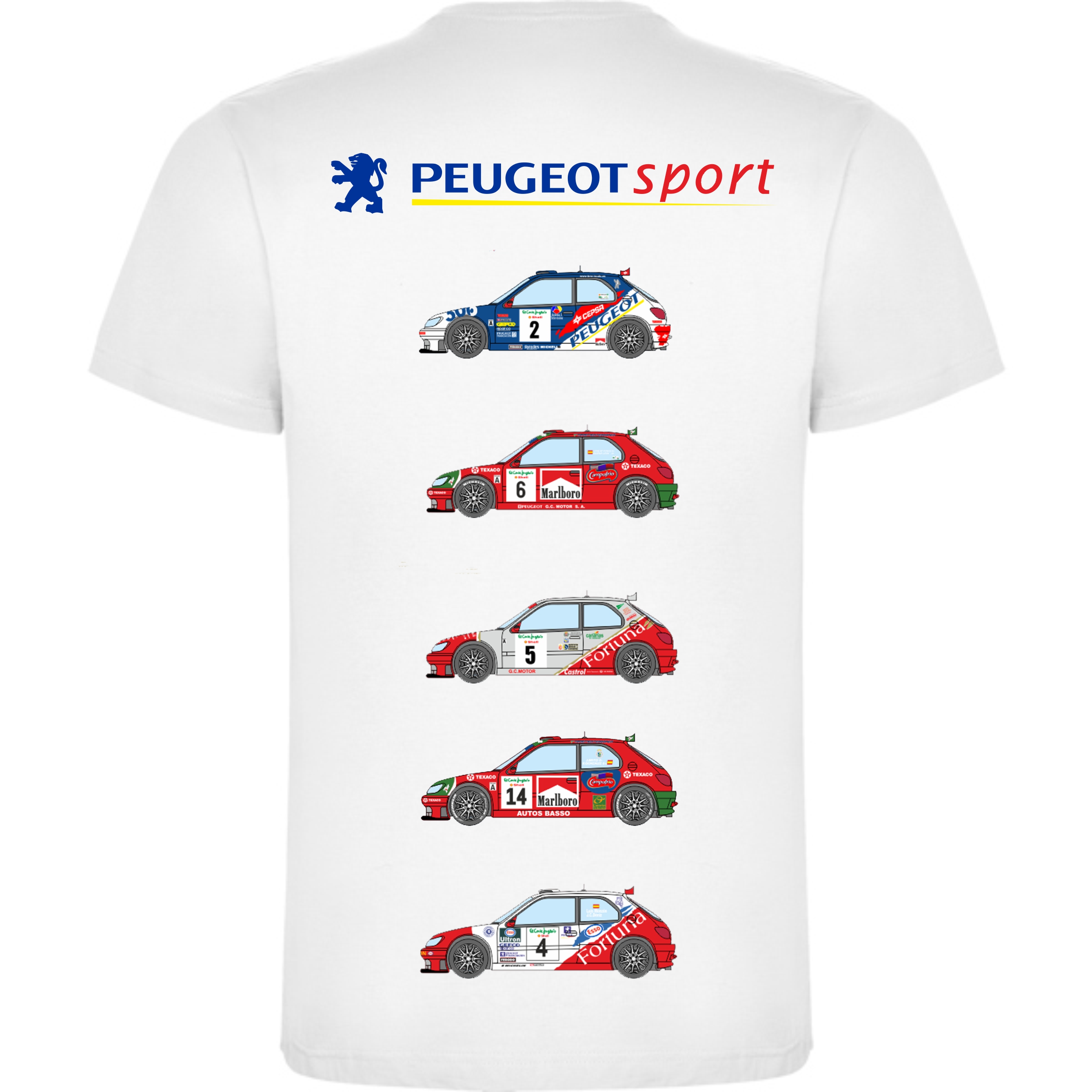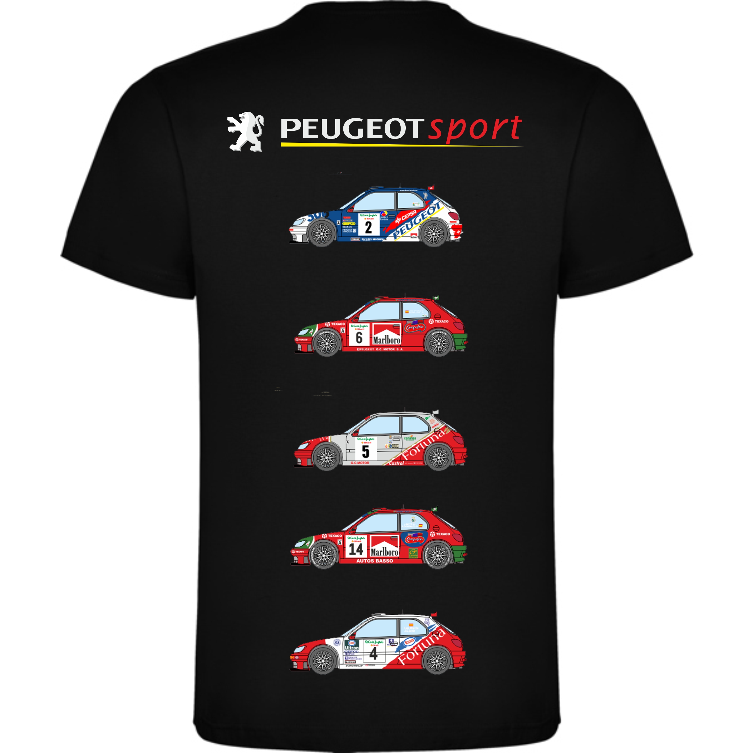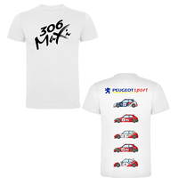 Camiseta de distintas rotulaciones del Peugeot 306 Maxi Kit Car por su paso en Canarias.