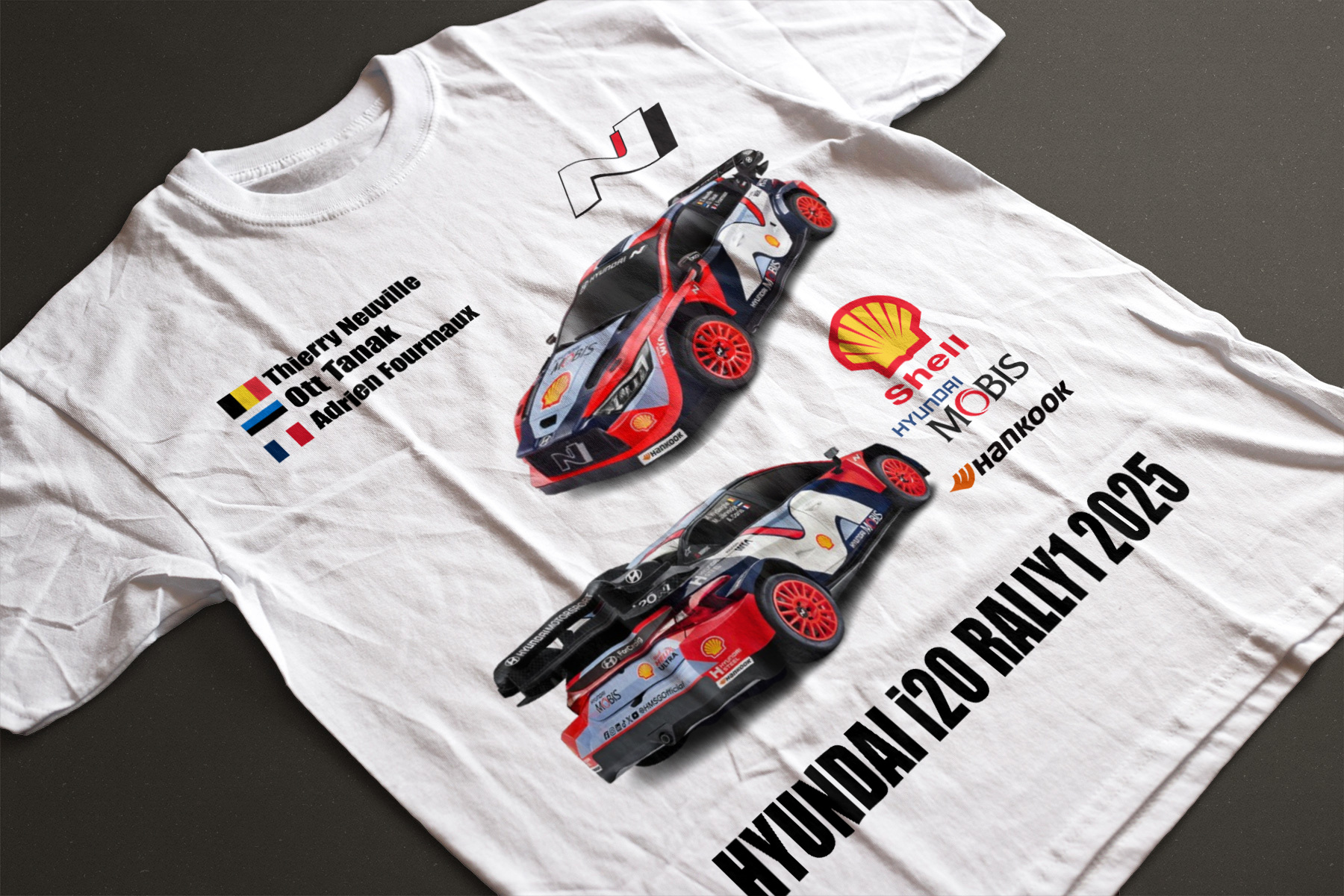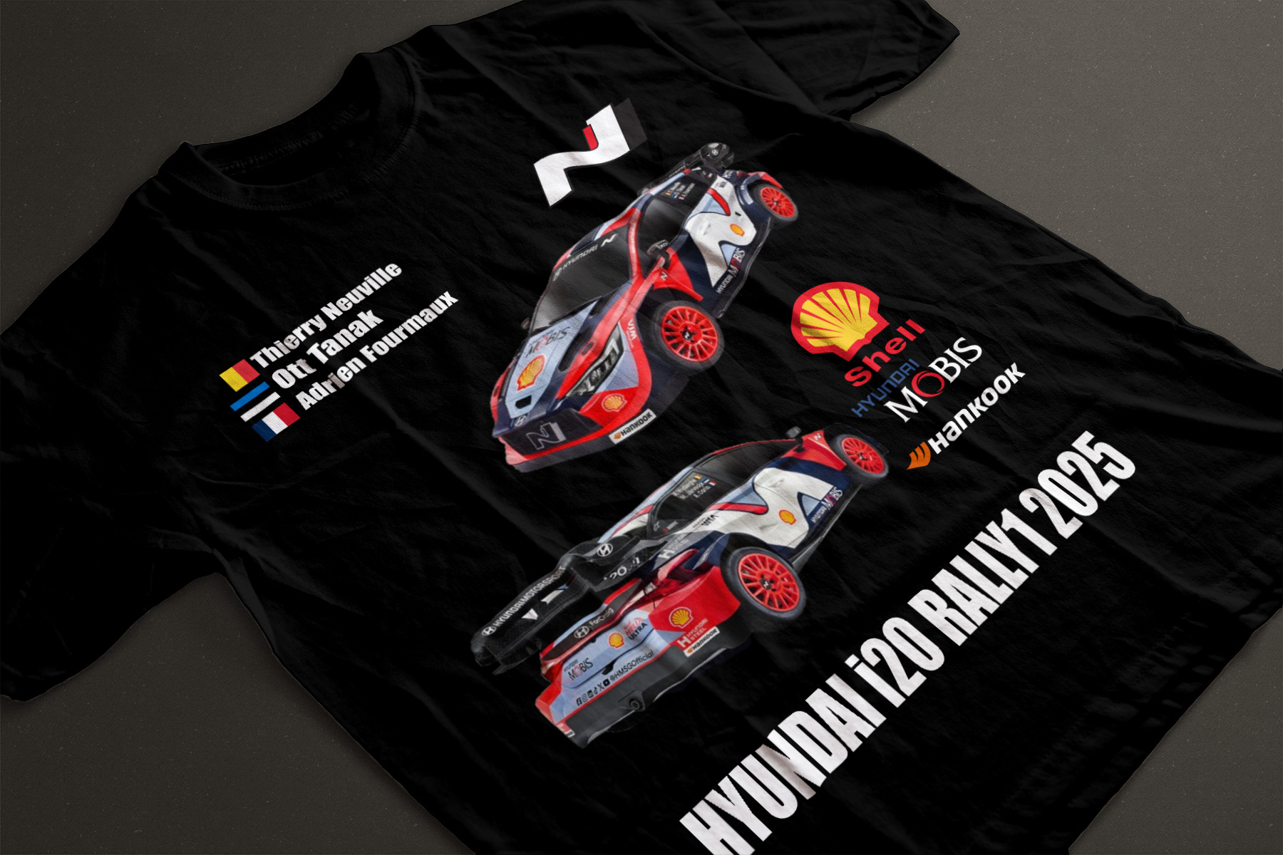 Camiseta del equipo Hyundai Shell Mobis World Rally Team 2025, con el Hyundai i20 Rally1 2025.