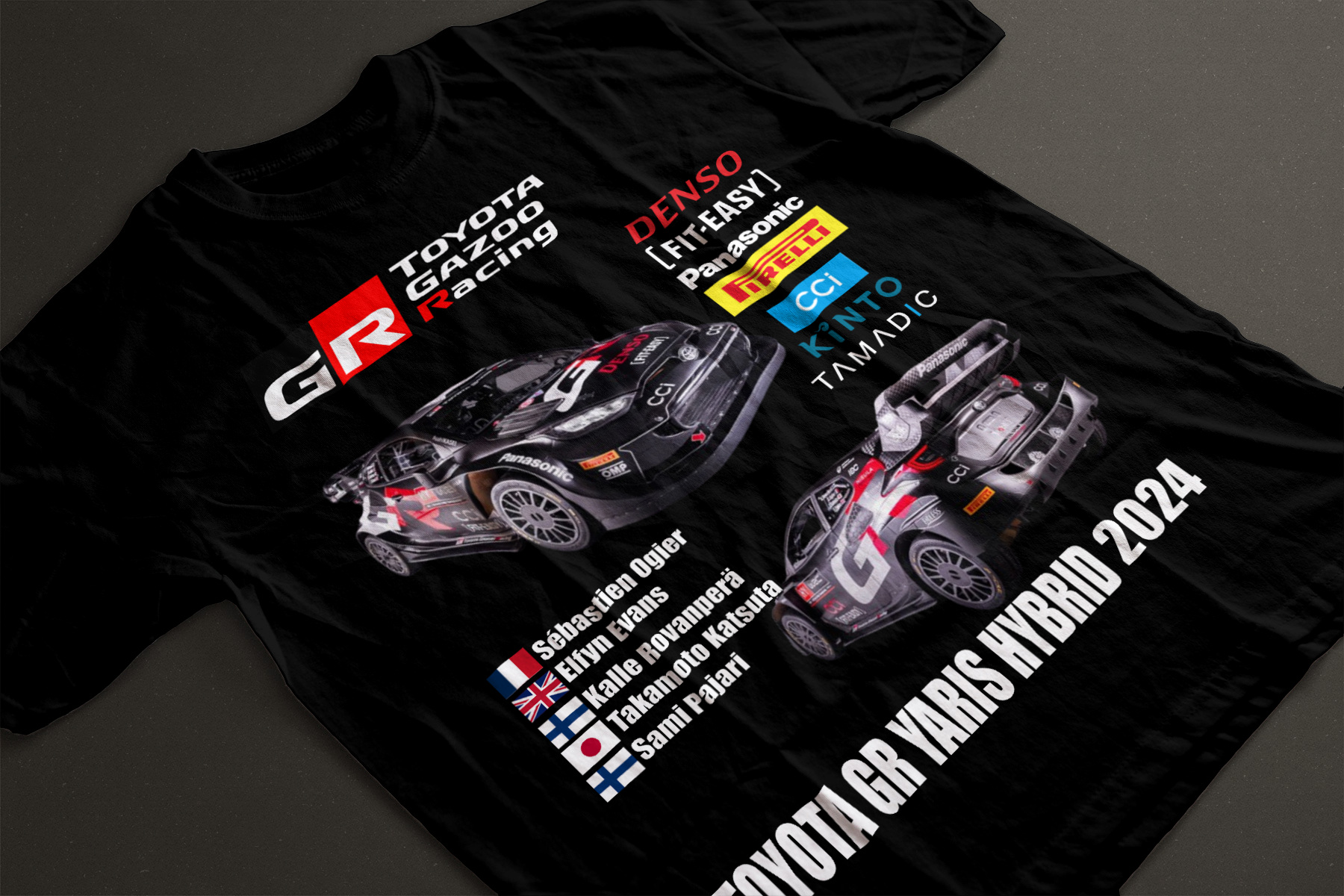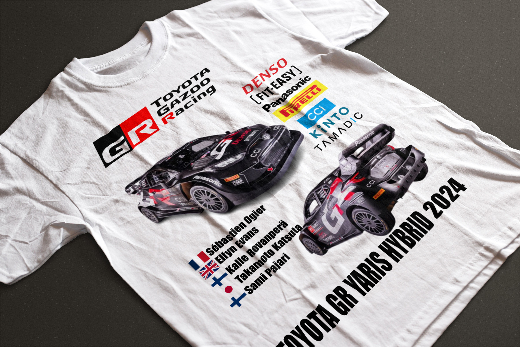 Camiseta del equipo Toyota Gazoo Racing 2024, con el Toyota Yaris Rally1 Hybrid 2024.