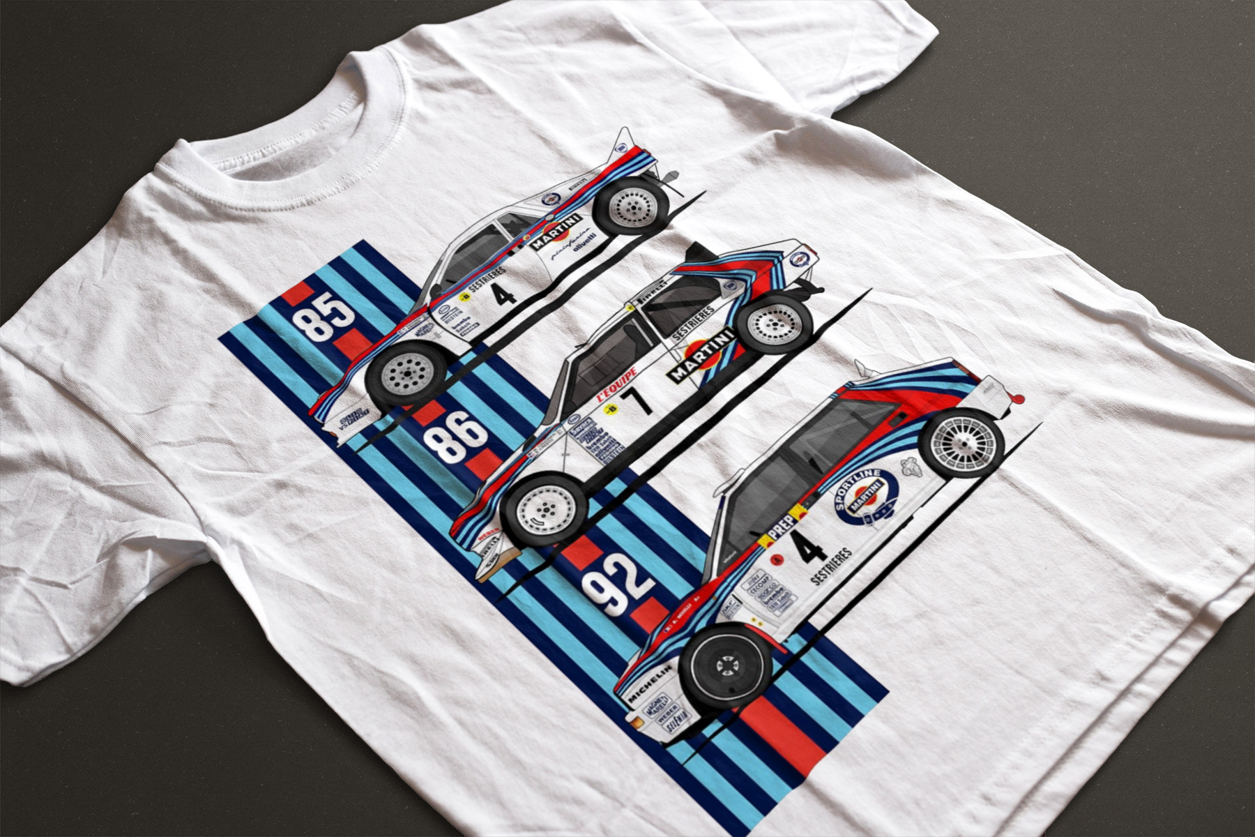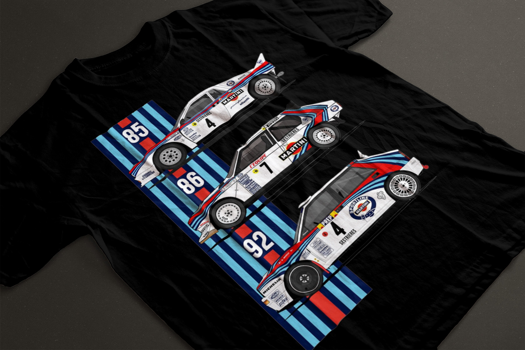 Camiseta de la Historia de los Lancia Martini Racing, comenzando en 1985 con el Lancia 037, siguiendo con el monstruo del Lancia Delta S4 y continuando con el Lancia Delta Integrale.