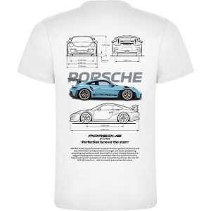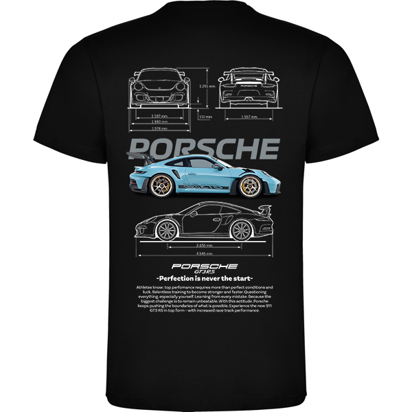 Camiseta del Porsche GT3 RS de color celeste con su descripción.