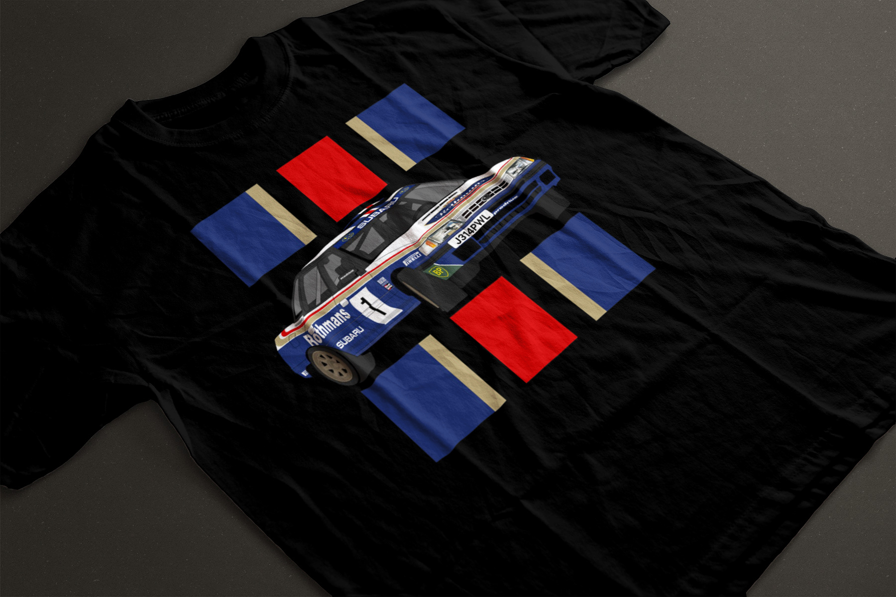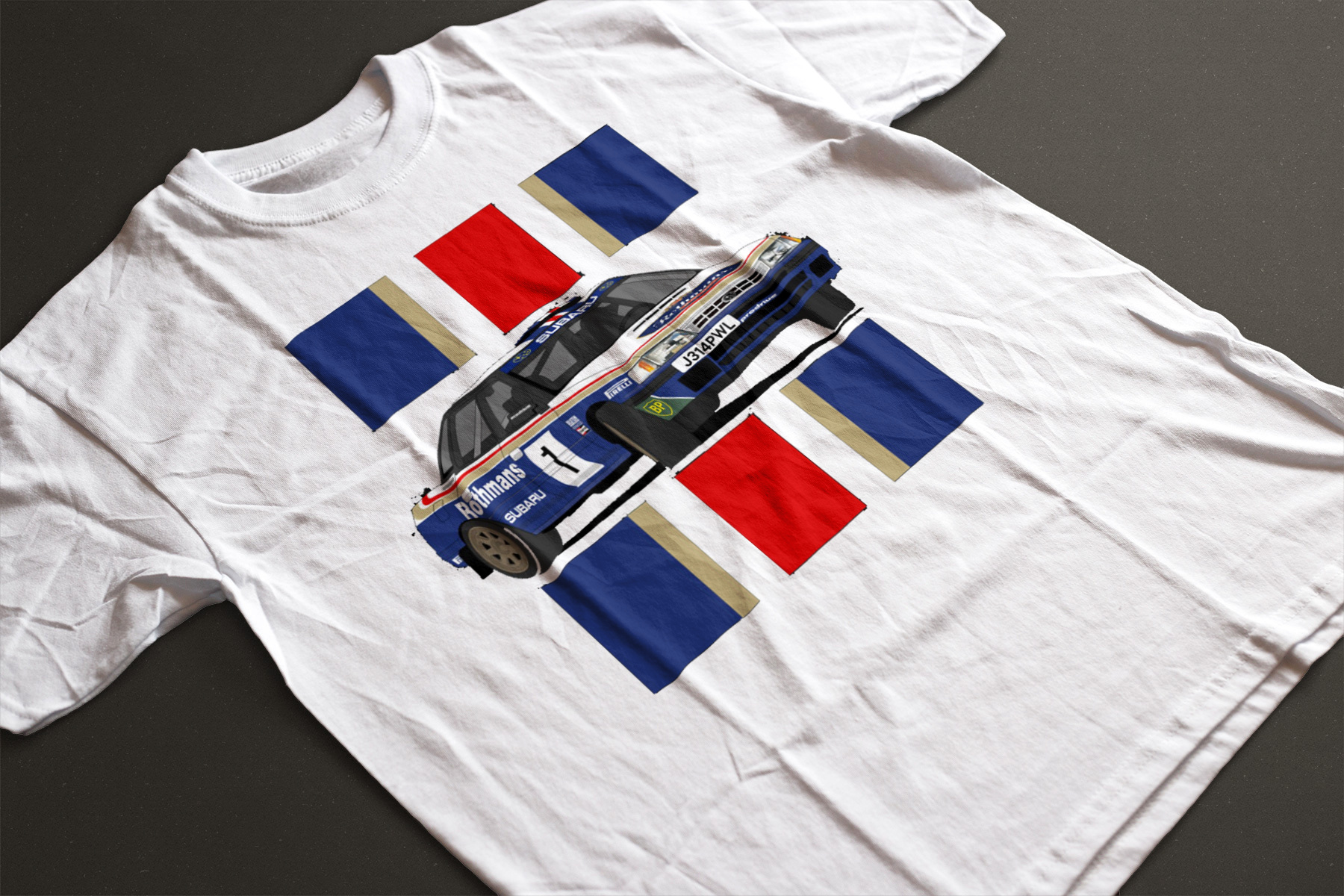 Camiseta Subaru Legacy con rotulación oficial del mundial de Rallyes.